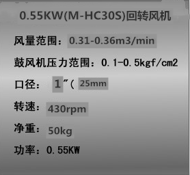 此款型號(HC-30S回轉(zhuǎn)風(fēng)機(jī))所配套為4級純銅國標(biāo)品牌電機(jī)0.55kw,電機(jī)不耐濕,請保持電機(jī)干燥,注意電機(jī)轉(zhuǎn)向應(yīng)與風(fēng)機(jī)轉(zhuǎn)向標(biāo)志一致。本產(chǎn)品電機(jī)配置均為380V電源。有需要220V電源事先說明。默認(rèn)按照380V電源配置電機(jī)。